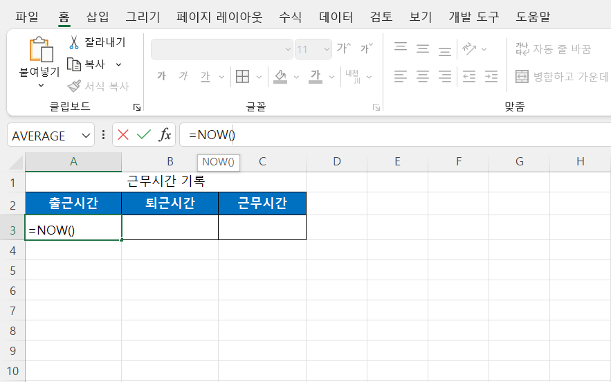 - 출근 시간: =NOW()