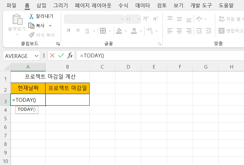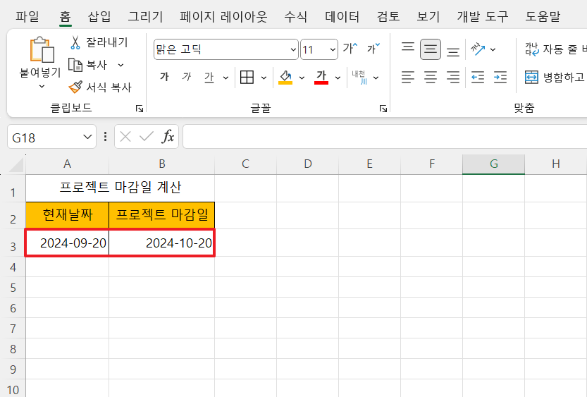 - 프로젝트 마감일 (현재 날짜로부터 30일 후): =A3 + 30