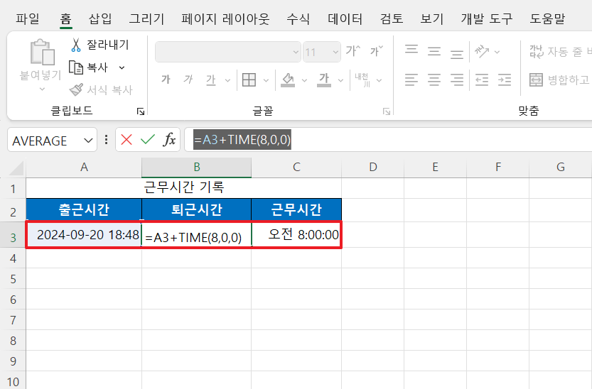 - 퇴근 시간: =A3 + TIME(8, 0, 0) (8시간 후)