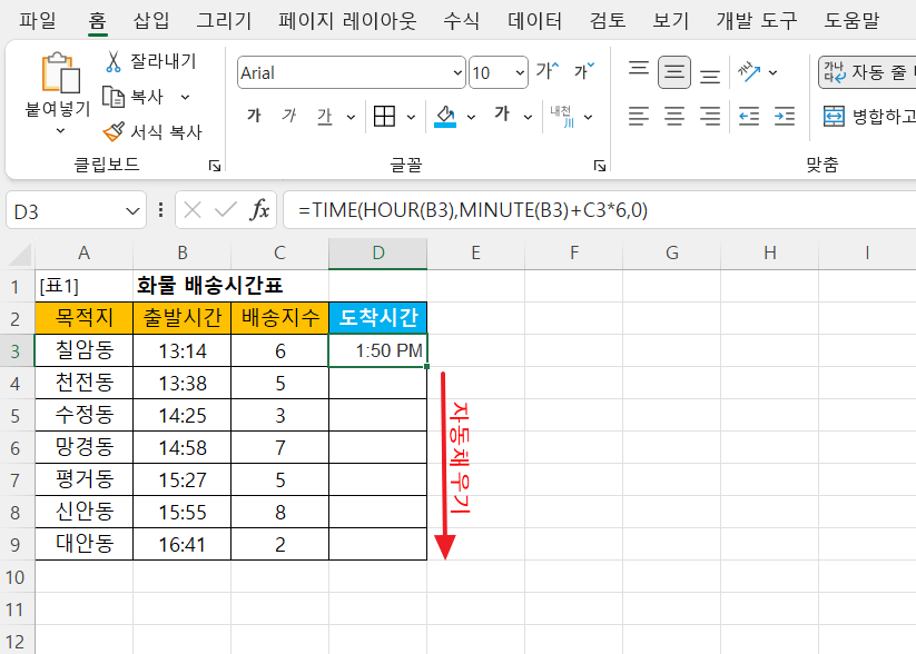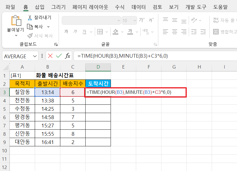 - MINUTE(B3) + C3 * 6: 출발시간의 분에 배송지수(C3)와 배송지수 당 소요 시간(6분)을 곱한 값을 더합니다. 이는 총 소요시간을 계산하는 과정입니다.