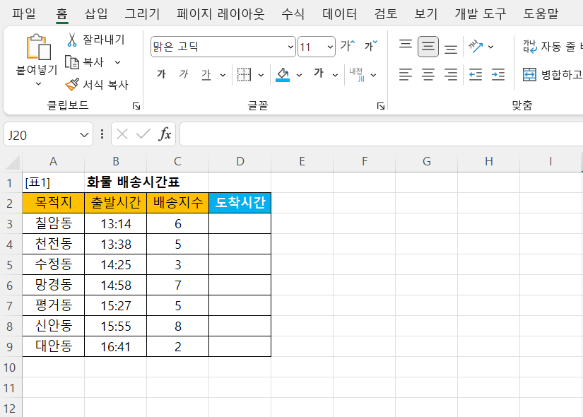 엑셀 [표 1]에서 주어진 정보를 바탕으로 TIME, HOUR, MINUTE 함수를 사용하여 도착시간을 계산하는 방법을 단계별로 설명하겠습니다. 도착시간은 출발시간에 배송지수에 따른 소요 시간을 더하여 계산됩니다. 배송지수당 소요 시간은 6분입니다.