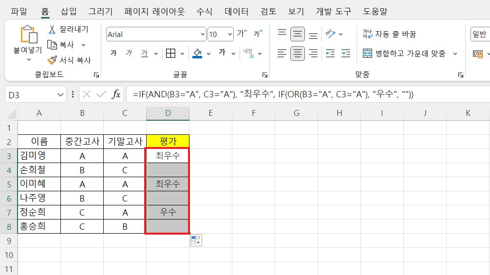 ① 평가 열(D3) 선택 - 수식 입력 =IF(AND(B3="A", C3="A"), "최우수", IF(OR(B3="A", C3="A"), "우수", ""))