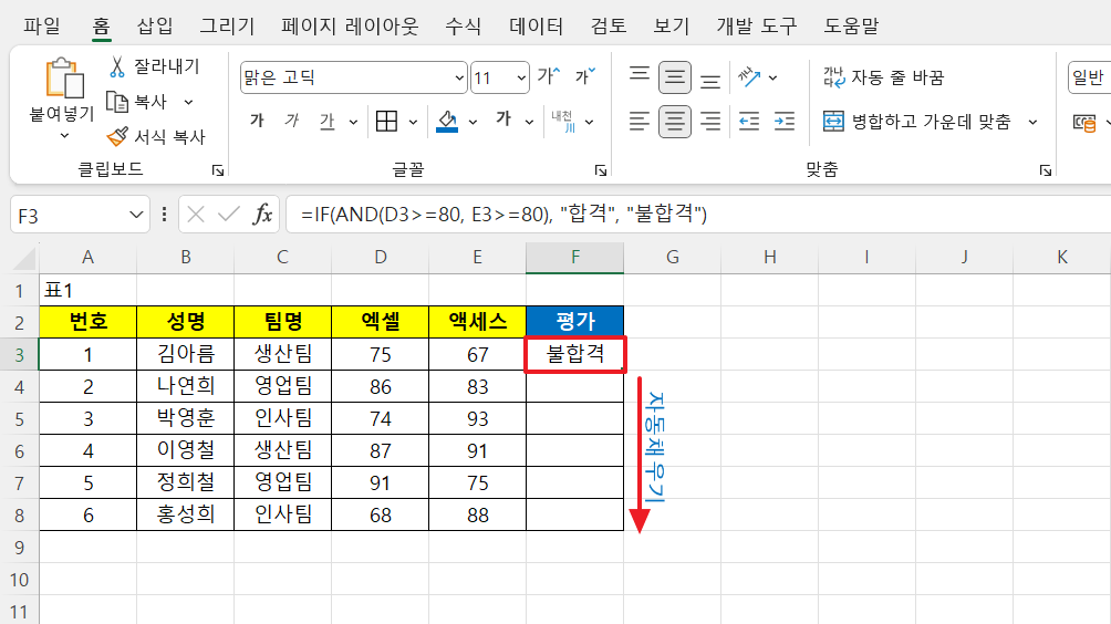 ④ 최종 결과: 엑셀, 액세스 점수가 모두 80점 이상인 경우 "합격", 그렇지 않은 경우 "불합격"이라는 결과가 자동으로 평가 항목에 표시됩니다.