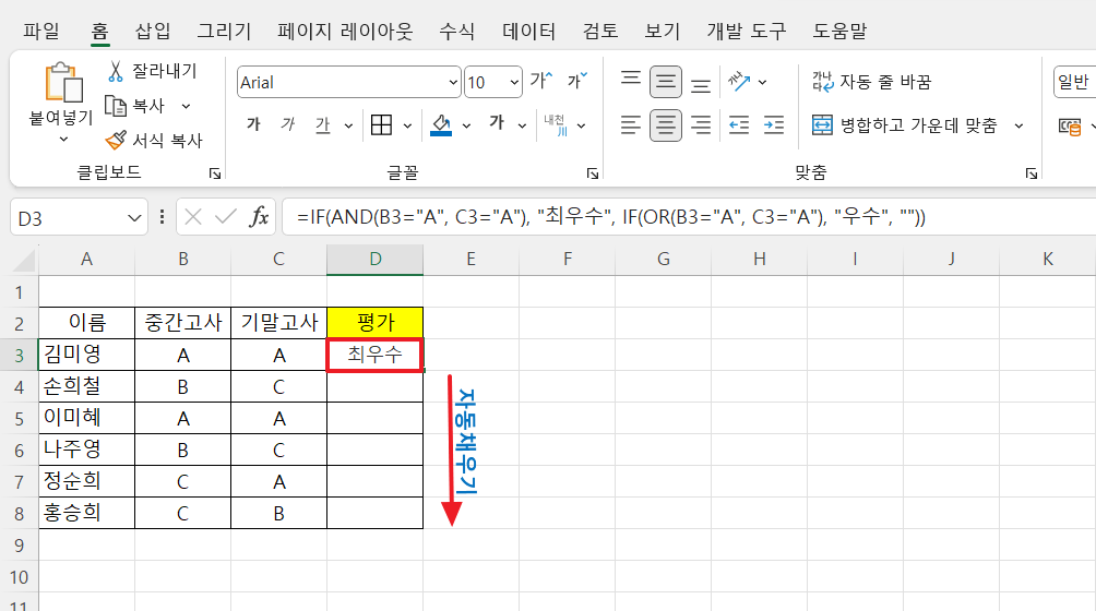 ① AND 함수: 중간고사(B3)와 기말고사(C3) 성적이 모두 "A"인 경우, "최우수"로 평가합니다.
