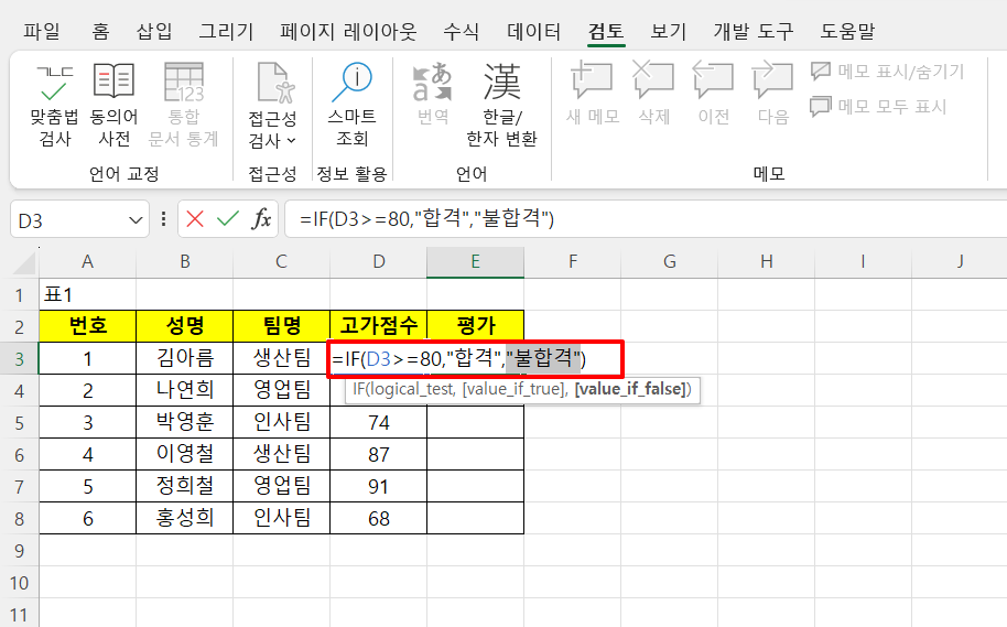 엑셀에서 고가점수가 80점 이상이면 "합격", 그렇지 않으면 "불합격"으로 평가하는 방법을 예제로 설명하겠습니다.