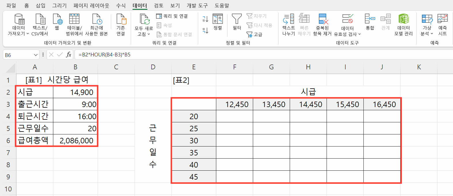 이번 예제에서는 시간당 급여에 따른 시급 데이터표를 활용하여 엑셀에서 데이터 표를 작성하고, 이를 통해 다양한 시나리오를 시뮬레이션하는 방법을 순서대로 설명하겠습니다.