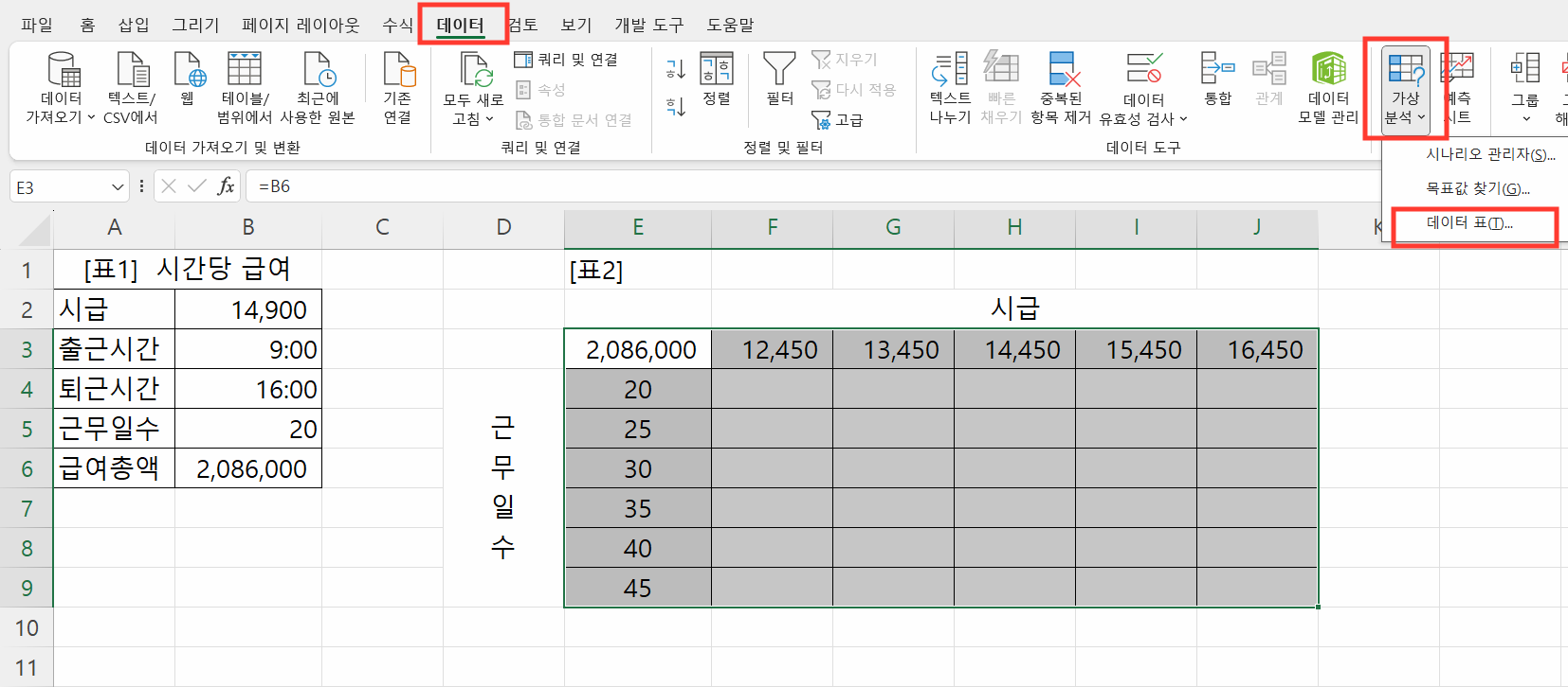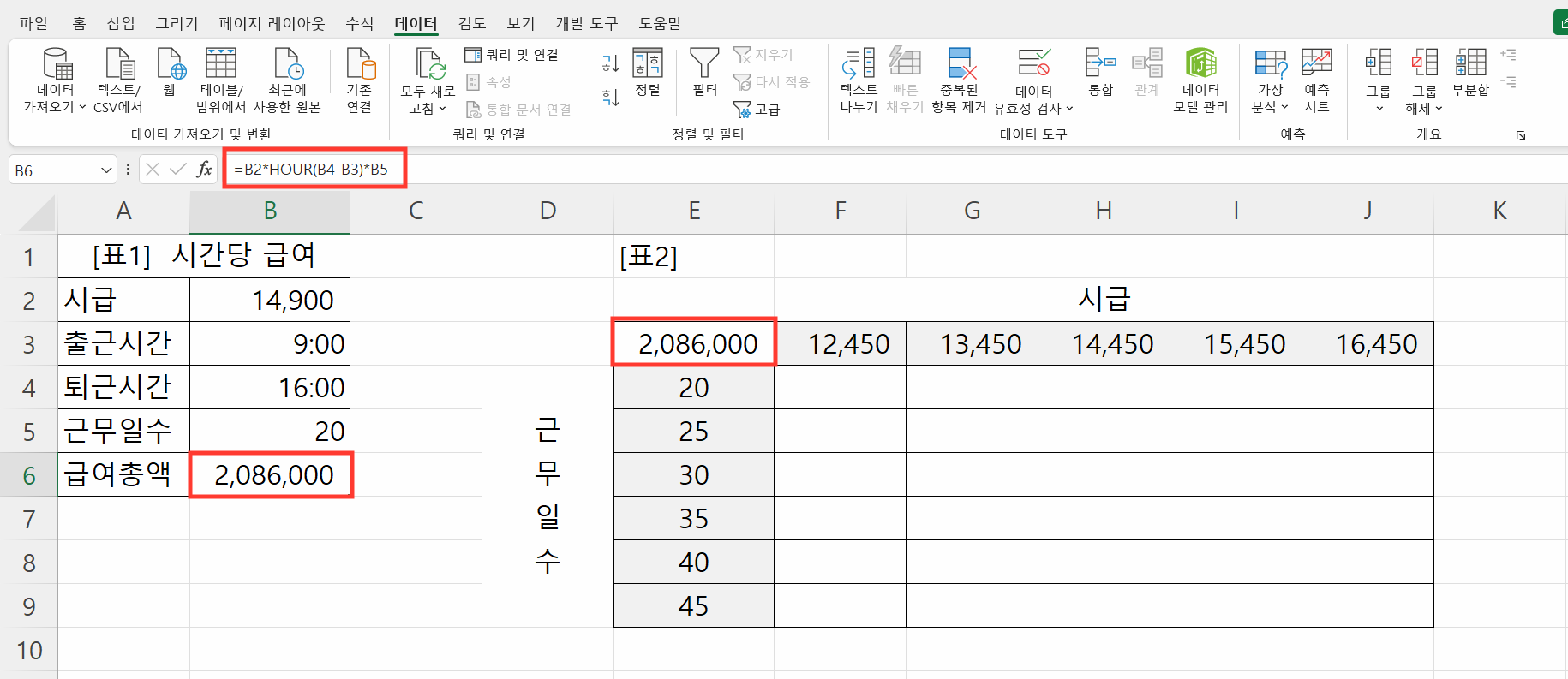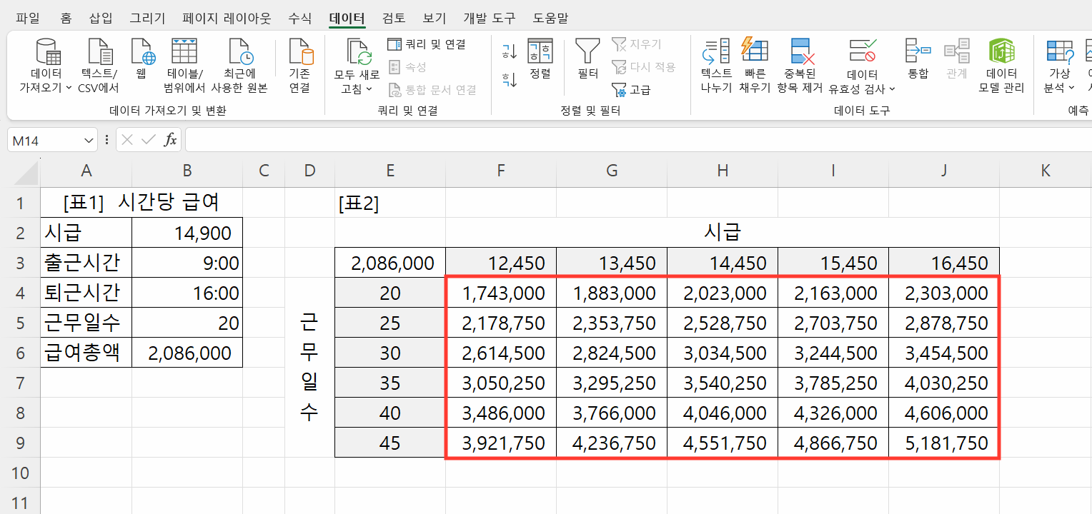 4. 엑셀 데이터 표 활용 실무 예제: 시간당 급여와 근무 일수의 변화에 따른 급여 총액 계산