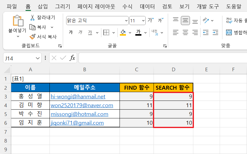 아래의 [표 1]에서 엑셀의 SEARCH 함수를 사용하여 메일 주소에서 '@'의 위치를 찾는 예제입니다.