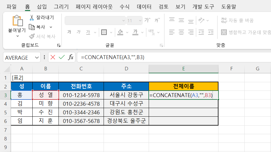 📌 최근 버전의 엑셀에서는 CONCATENATE 함수 대신 & 연산자나 TEXTJOIN 함수를 사용할 수 있습니다. 예를 들어, =A3&""&B3로도 같은 결과를 얻을 수 있습니다.