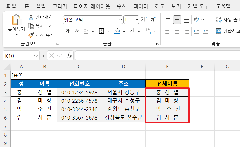 - 예시: =CONCATENATE("안녕", " ", "하세요") → 결과: "안녕하세요"
