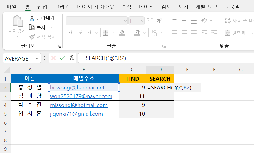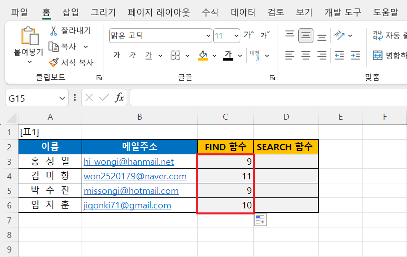 아래의 [표 1]에서 엑셀의 SEARCH 함수를 사용하여 메일 주소에서 '@'의 위치를 찾는 예제입니다.