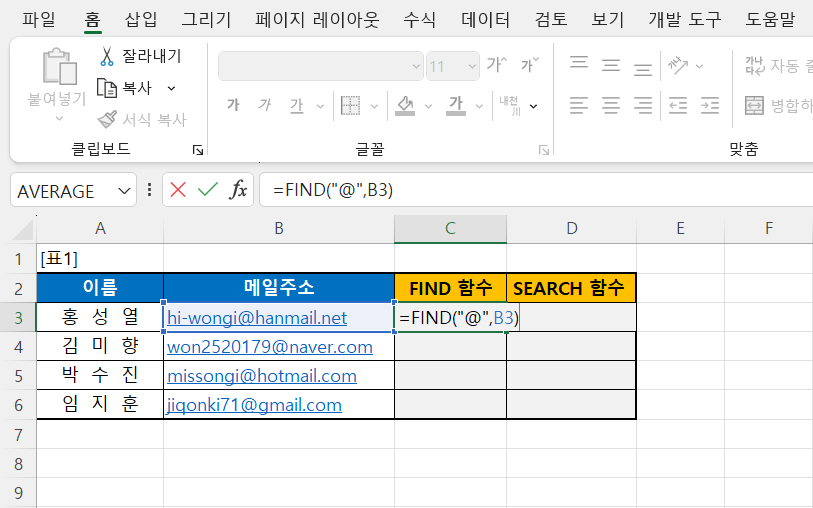 아래의 [표 1]에서 엑셀의 FIND 함수를 사용하여 메일 주소에서 '@'의 위치를 찾는 예제입니다.