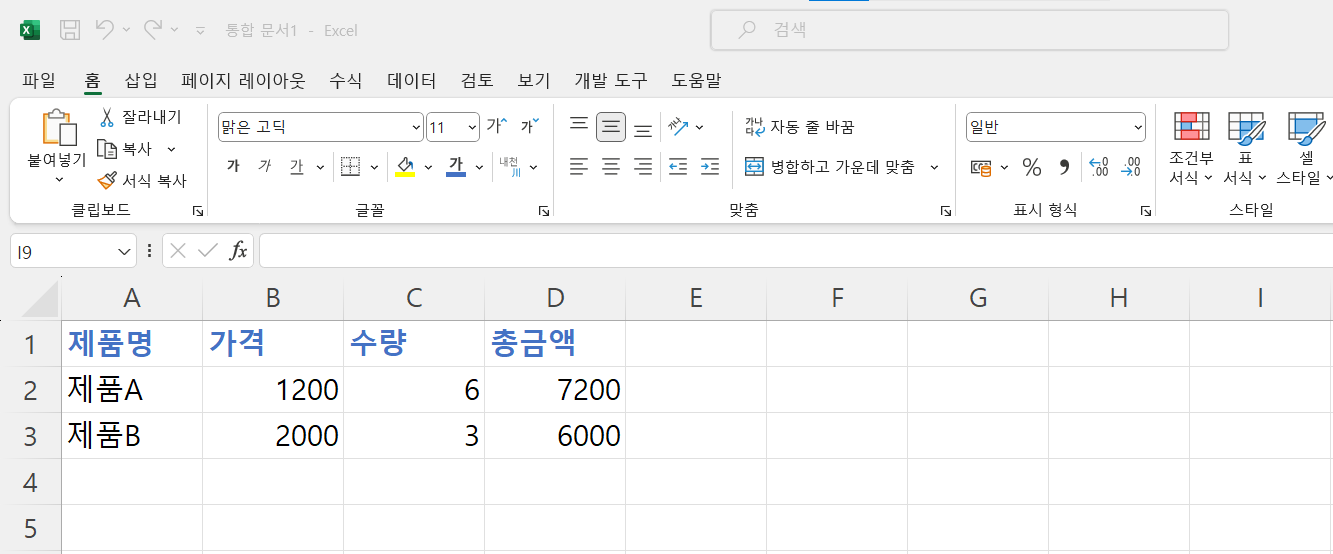 • A1 셀에 "제품명", B1 셀에 "가격", C1 셀에 "수량", D1 셀에 "총금액"을 입력합니다.