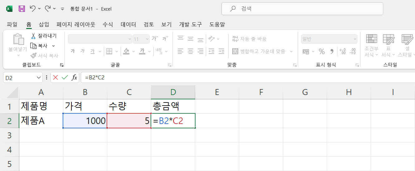 • A2 셀에 "제품 A", B2 셀에 "1000", C2 셀에 "5", D2 셀에 =B2*C2를 입력합니다.