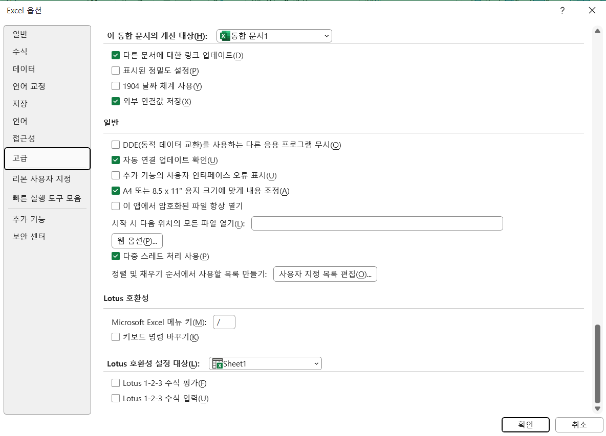 • [파일] - [옵션] - [고급]으로 이동한 후, 아래로 스크롤하여 [사용자 지정 목록 편집] 버튼을 선택합니다.