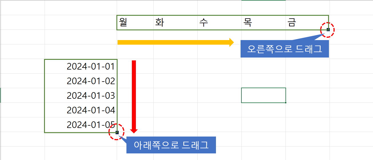 - 날짜 입력: '2024-01-01'을 입력하고 자동 채우기를 사용하면 연속된 날짜가 입력됩니다.