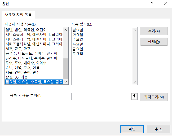 - [사용자 지정 목록]에 자동채우기에 적용할 항목을 입력한 뒤 [추가] 버튼을 누릅니다. 그 다음에 [확인] 버튼을 누르면 사용자 지정 목록 추가가 완료됩니다.