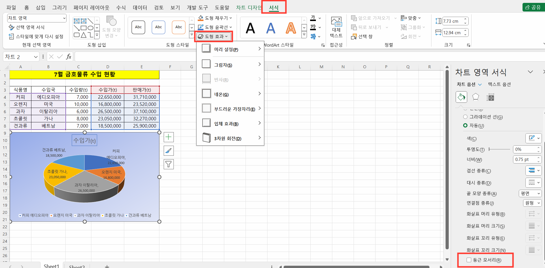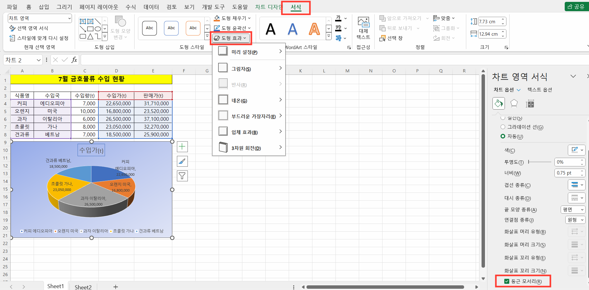 ② [도형 효과] - [모서리 둥글게]를 선택하여 차트 영역의 테두리를 둥글게 설정합니다.