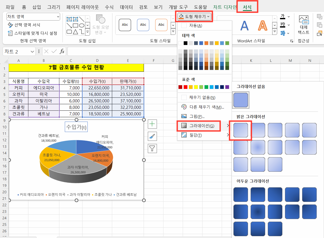 ② [도형 채우기] - [그러데이션]을 선택합니다.