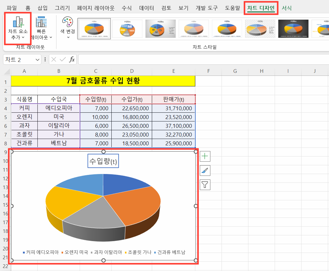 ① 차트를 선택하고, 상단 메뉴에서 '차트 디자인' 탭을 클릭합니다.