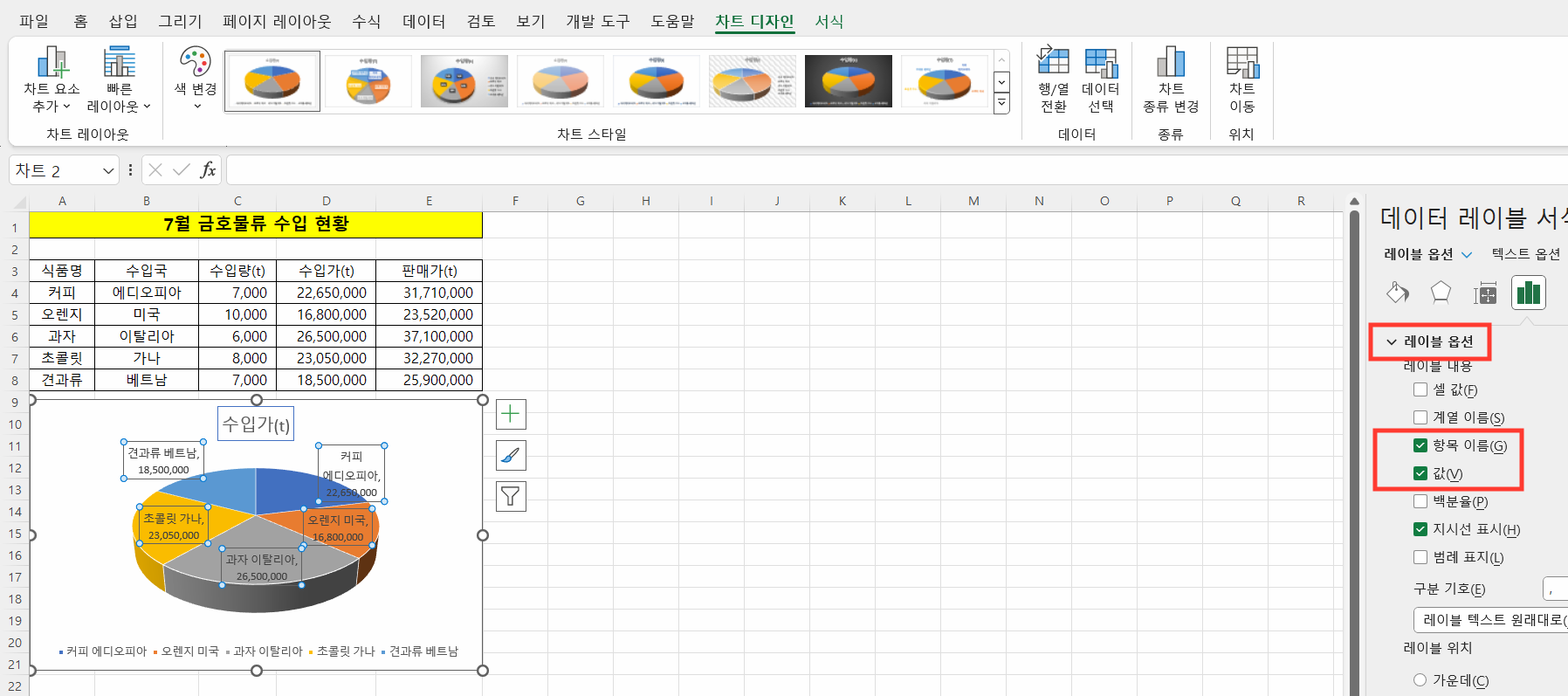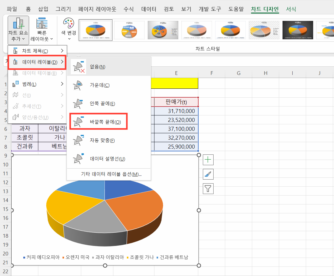 데이터 레이블을 바깥쪽 끝에 '항목 이름'과 '값'을 지정해 보겠습니다.