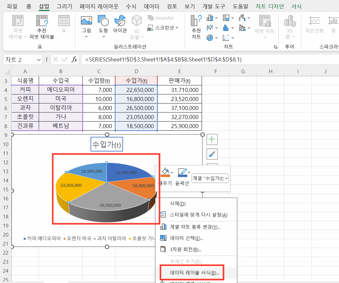 ① 데이터 레이블을 선택한 상태에서 우클릭하여 '데이터 레이블 서식'을 선택합니다.