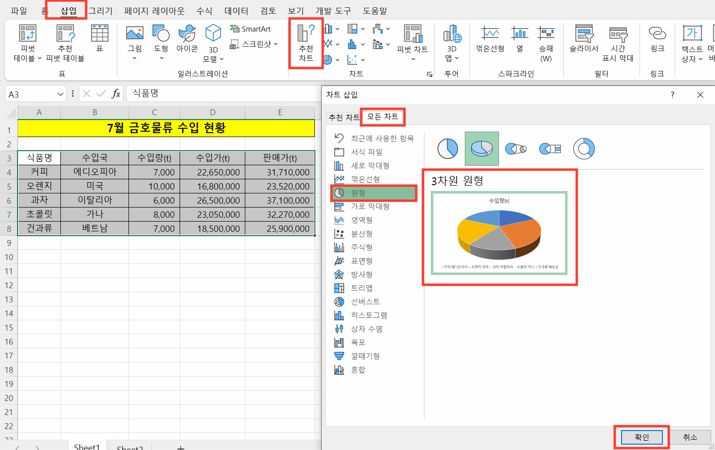 ③ [모든 차트] - [원형] - [3차원 원형] 데이터를 선택한 후 확인을 클릭하면 차트가 삽입됩니다.