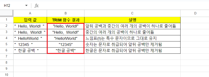 - 중간 공백: TRIM 함수는 단어 사이의 공백은 유지합니다. 즉, 단어 사이에 하나 이상의 공백이 있는 경우 하나의 공백으로 줄여줍니다.