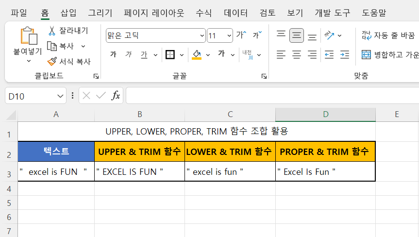 - UPPER(...): TRIM 함수로 처리된 텍스트를 대문자로 변환합니다. 결과는 "EXCEL IS FUN"입니다.