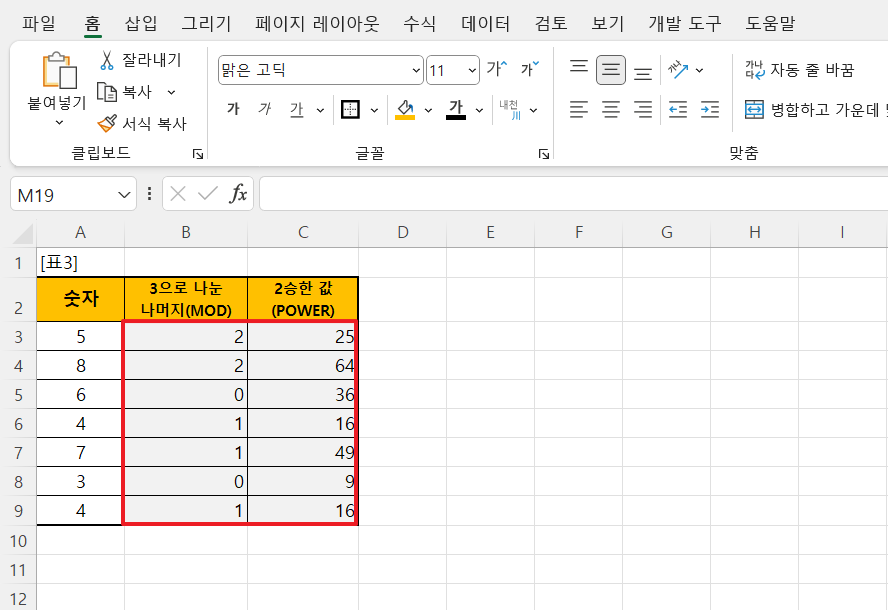 ① 수식 입력: B3셀에 =MOD(A3, 3), C3셀에 =POWER(A3, 2) 수식을 입력합니다.