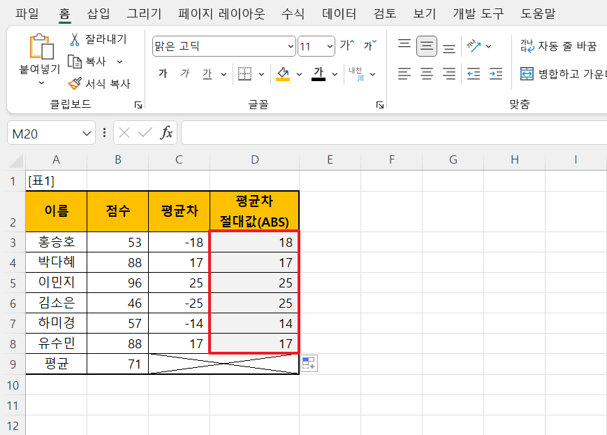 ② 최종 결과: 최종적으로 D열에는 각 학생의 평균차 절댓값이 나타납니다. 수식 적용 후 결과는 다음과 같습니다.