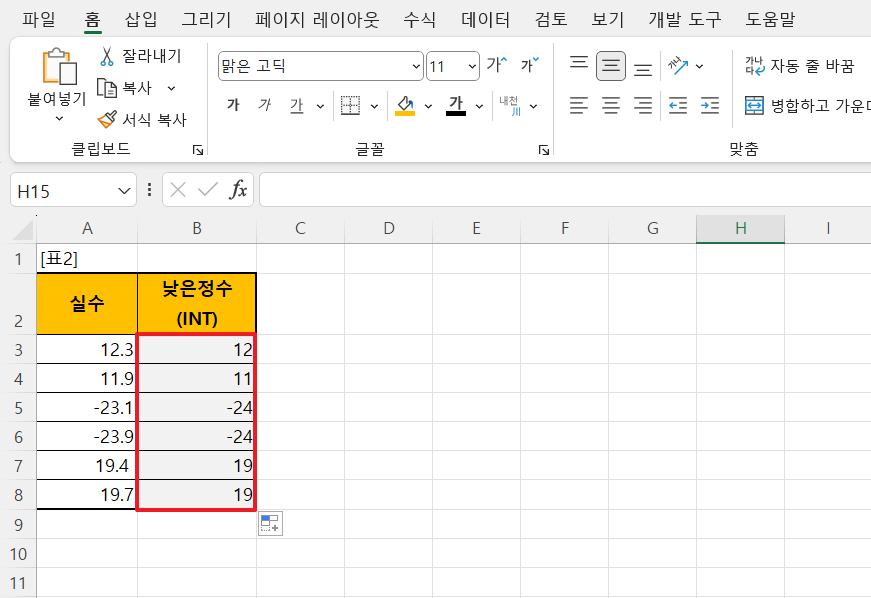 ② 최종 결과: 최종적으로 B열에는 각 실수의 낮은 정수 값이 나타납니다. 수식 적용 후 결과는 다음과 같습니다.